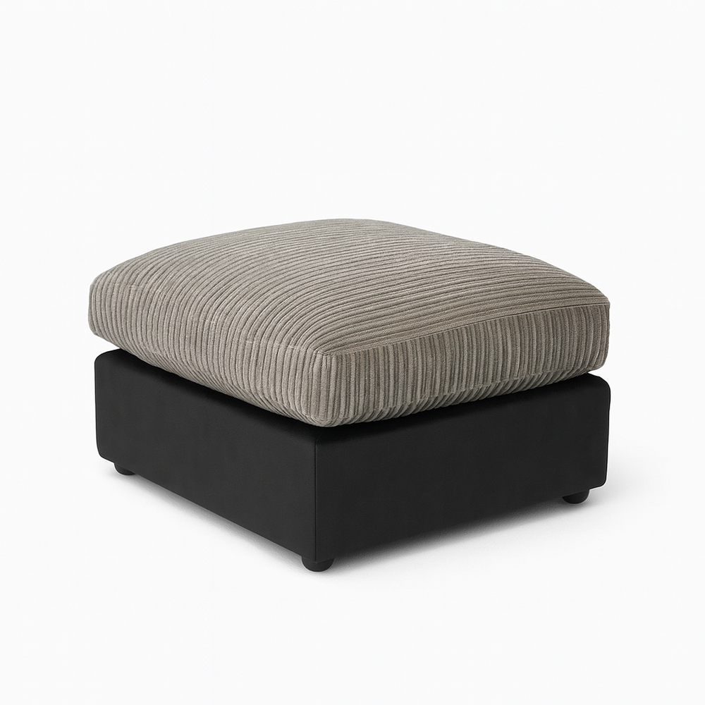 The footstool features a chic two-tone design with a soft, ribbed jumbo cord cushion top in a neutral grey tone, paired with a sleek black leather-effect base. This blend of textures creates a modern and sophisticated look, making it a stylish addition to any living room.